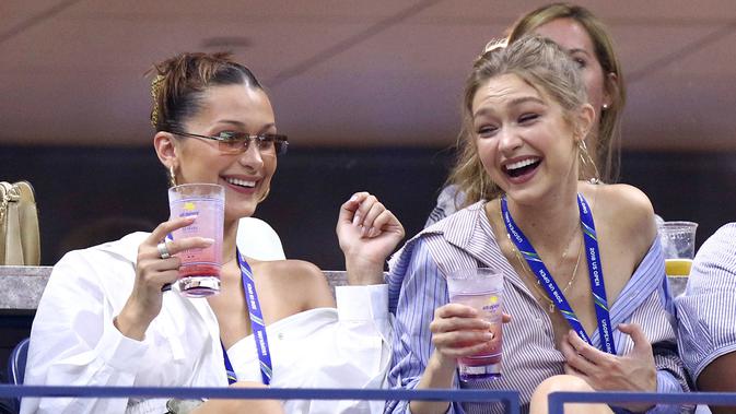 Supermodel Gigi Hadid bersama adiknya, Bella Hadid menyaksikan perempat final tunggal putri antara petenis AS, Serena Williams melawan Karolina Pliskova (Ceko) pada hari ke-9 turnamen AS Terbuka di New York, Selasa (4/9). (Julian Finney/Getty Images/AFP)