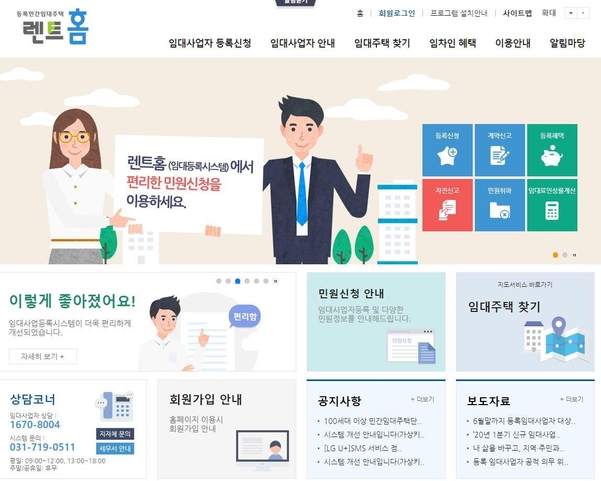 렌트홈은 임대사업자 등록 신청과 임대차 계약, 의무의반 자진신고 등 업무를 처리할 수 있는 홈페이지다. 주무부처는 국토부로, 한국토지주택공사(LH)가 위탁 운영하고 있다.
