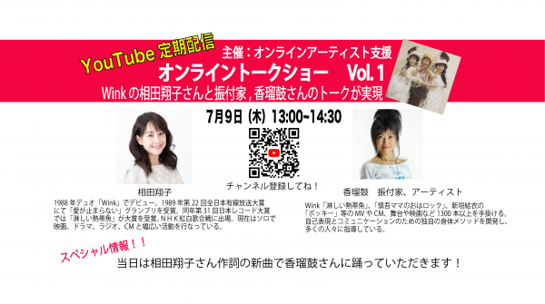 【オンラインアーティスト支援主催】7月9日(木)(13時~14時半)Winkの相田翔子さんと、振付家の香瑠鼓さんの夢のトークショー がオンライン無料生配信!その他トークイベントが目白押し! - Dream News