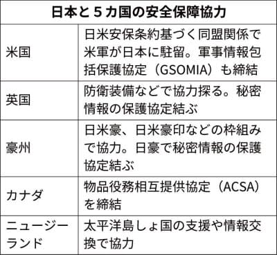 日本は5カ国と安全保障面で協力を進めている。米国は日米安全保障条約に基づく同盟関係に基づいて連携する。英豪などとの関係は「準同盟国」とも呼ばれ、情報保護協定や物品役務相互提供協定(ACSA)などを結んでいる。