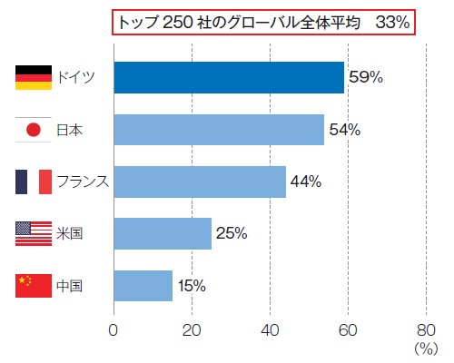 まず、年次報告書でCEO(最高経営責任者)または取締役が気候変動リスクに言及している割合は、ドイツ(59%)と日本(54%)が半数を上回った。世界の平均(33%)と比べても高く、トップダウンで対応している様子がうかがえる。温室効果ガスの2大排出国である中国と米国はともに平均を下回った。