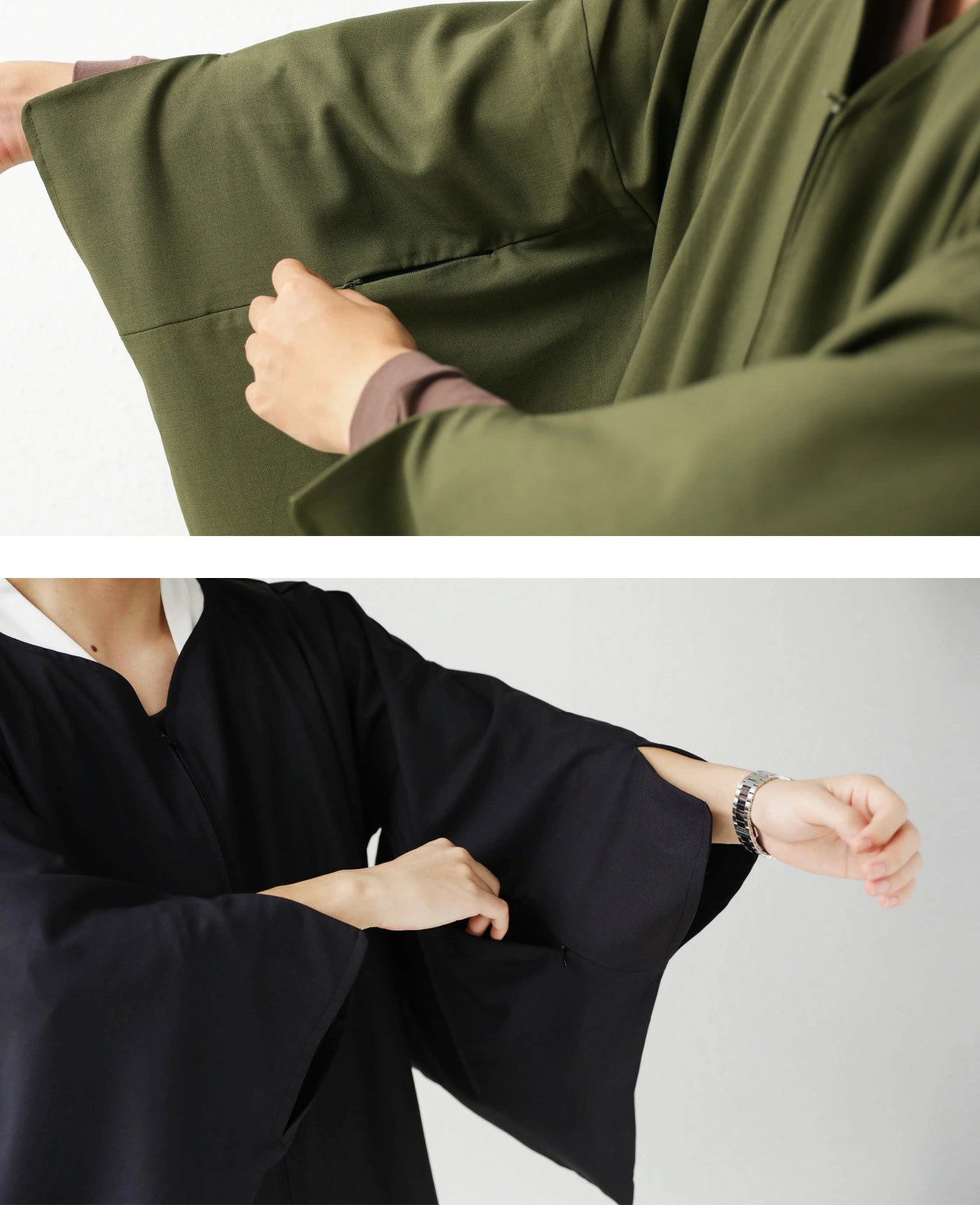着物のシンプルな四角い型をベースに、袖いっぱいに大きめのジッパーポケットをつけました。隠れたデザインジッパーで、ちょっとした遊び心を演出します。