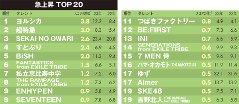 急上昇2位は、9人組男性グループの超特急。22年はライブに加え、イベントにも積極的に参加、新メンバー4人が加入したことも功を奏した。